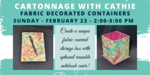 02/23/2025 @ 2:00 pm – 5:00 pm – **Recommended for ages 15+Let’s craft some memories!Looking for a new craft? Join instructor Cathie Heier at the studio to learn the art of Cartonnage! Cartonnage is the process of covering chipboard with fabric to build beautiful, useful things. We will be making a simple storage box that is perfect for your pens, scissors, rulers, paintbrushes, […]